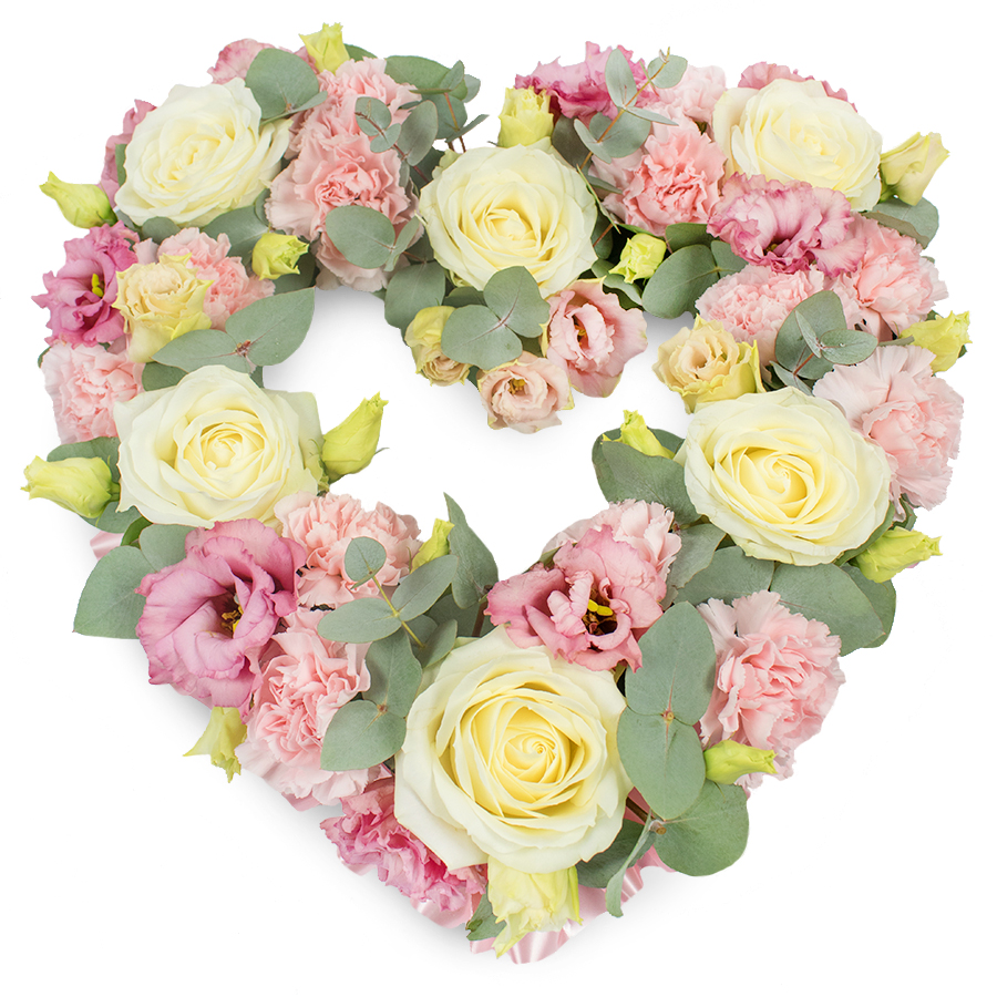 Convey your emotions with our luxurious open heart bouquet. This sophisticated arrangement features elegant white roses, lovely pink carnations, delicate pink lisianthus, and refreshing eucalyptus, all hand-picked to ensure peak freshness and longevity.